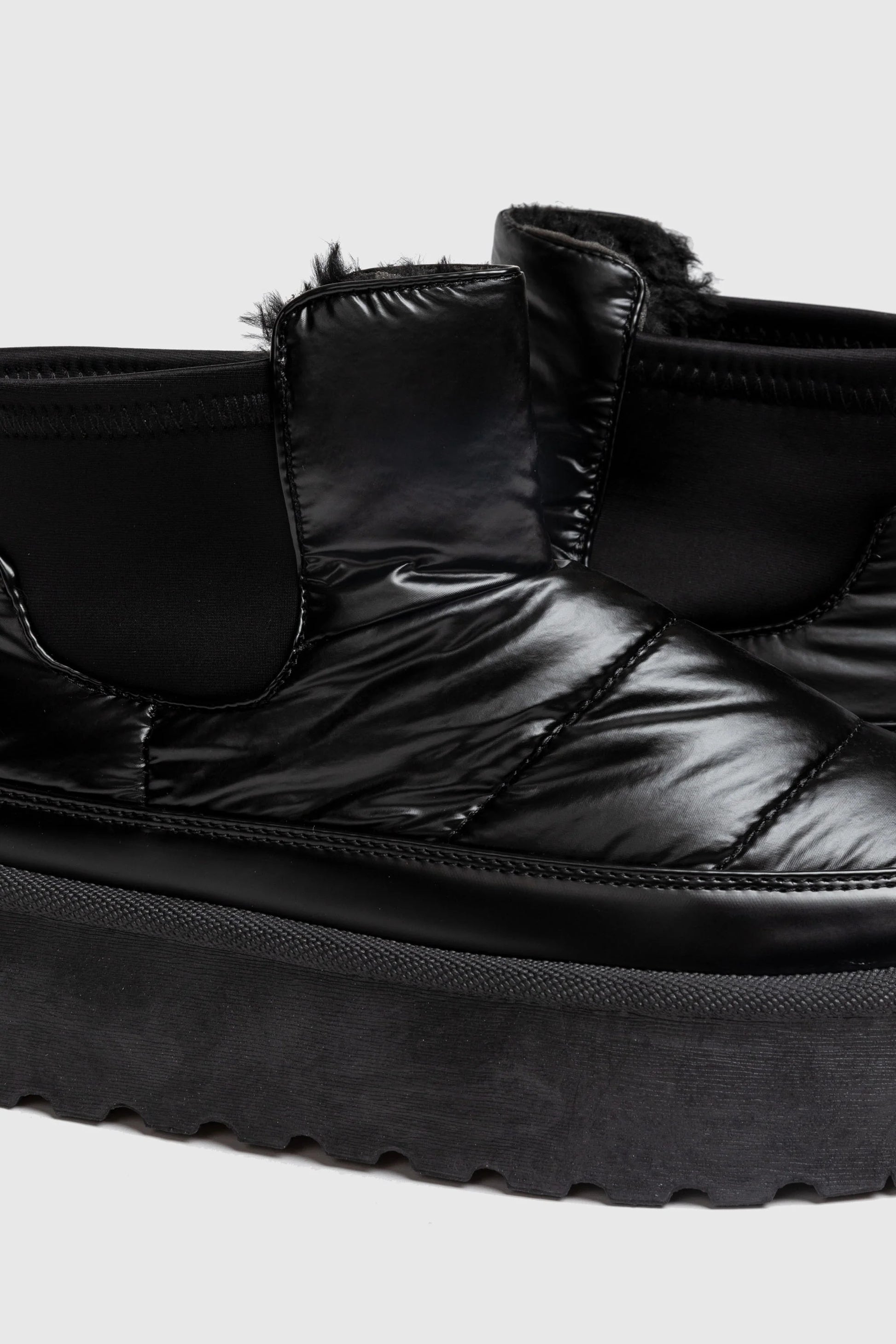 Botines con plataforma. Exterior Nylon. Punta redondeada. Interior efecto pelo. Suela tipo plataforma. Tirador trasero. Costuras visibles.
