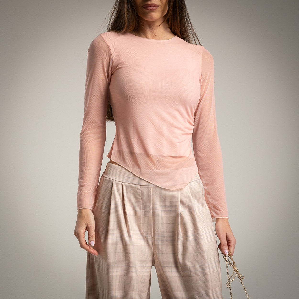 Ligero, etéreo y profundamente femenino. Este top confeccionado en tul delicado está diseñado para adaptarse a tu silueta como una segunda piel. Su diseño destaca por un drapeado lateral que culmina en un bajo asimétrico, creando un movimiento visual que estiliza la figura y rompe con lo convencional.